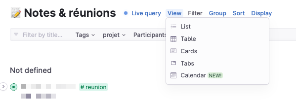 The configuration process for live queries is conducted through dropdown menus, which is an intuitive and streamlined approach. I utilized this feature to create lists that allowed for swift access to content, such as a project list, notes, and meetings grouped by project and ordered by date, and tasks grouped by project and ordered by the due date. This allowed me to quickly and easily access the content I needed to manage my project effectively.